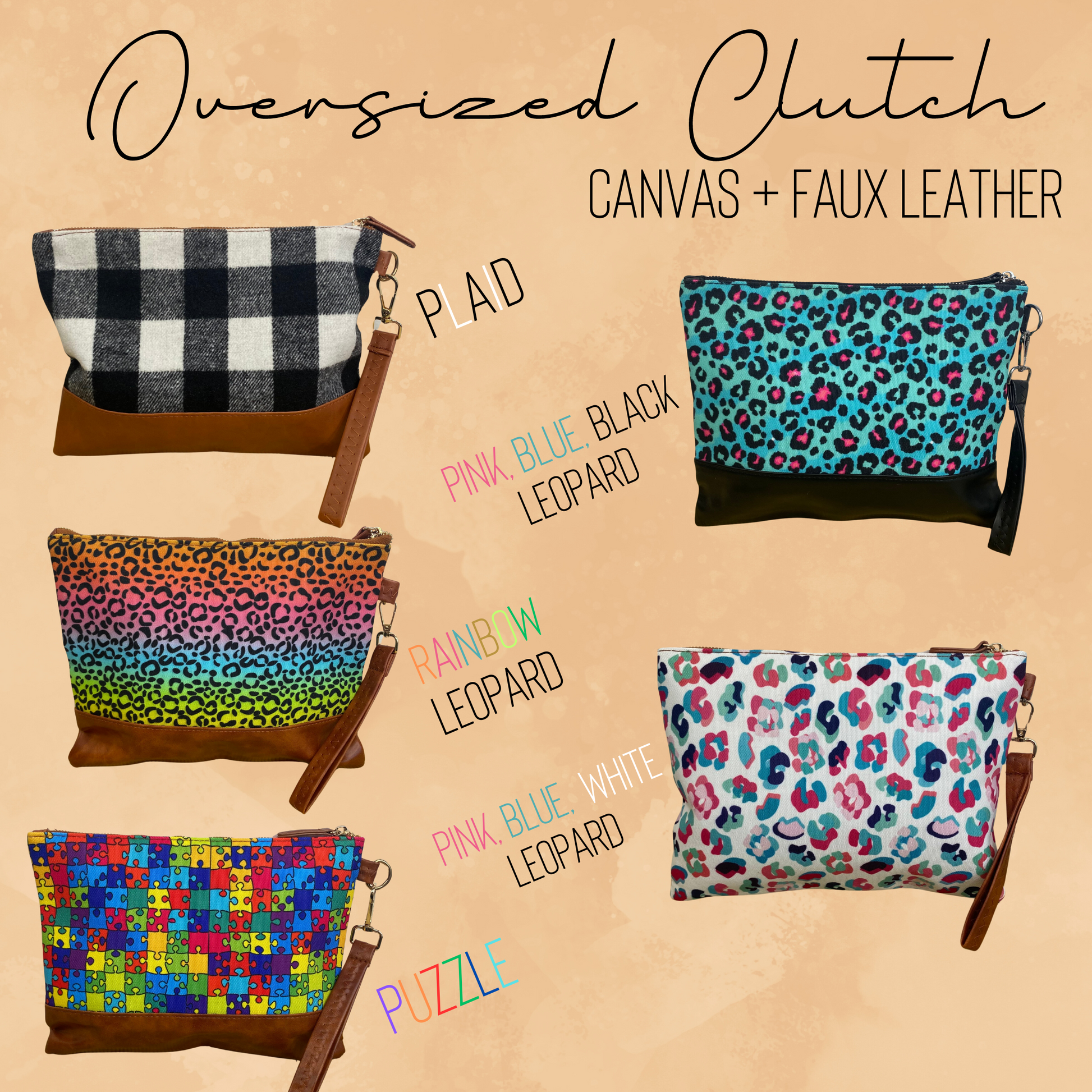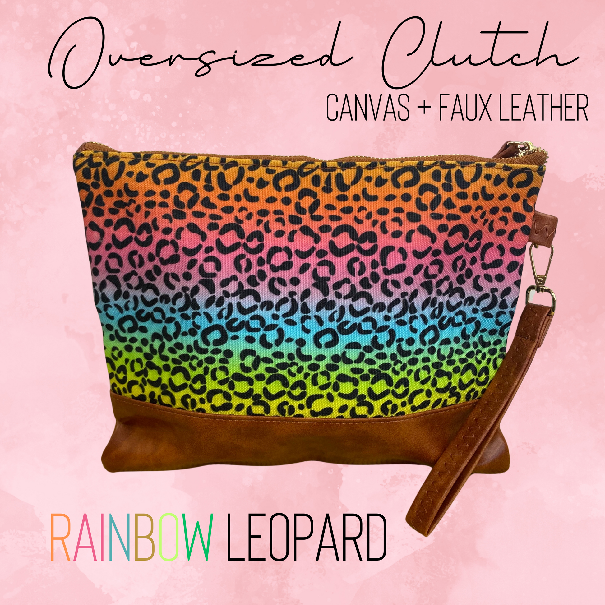 Clutch - Oversized Canvas & Faux Leather with Wrist Loop - Rainbow Leopard