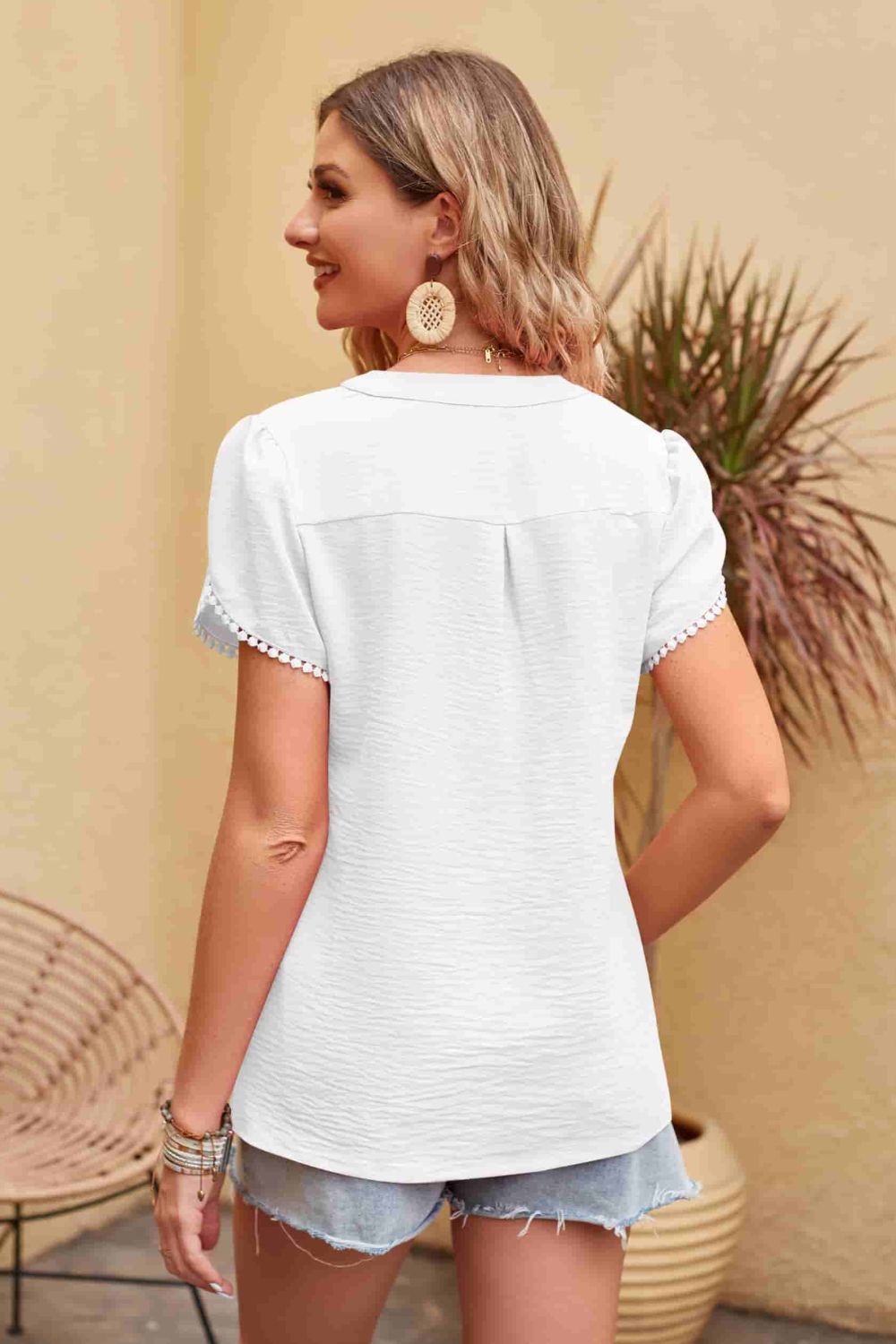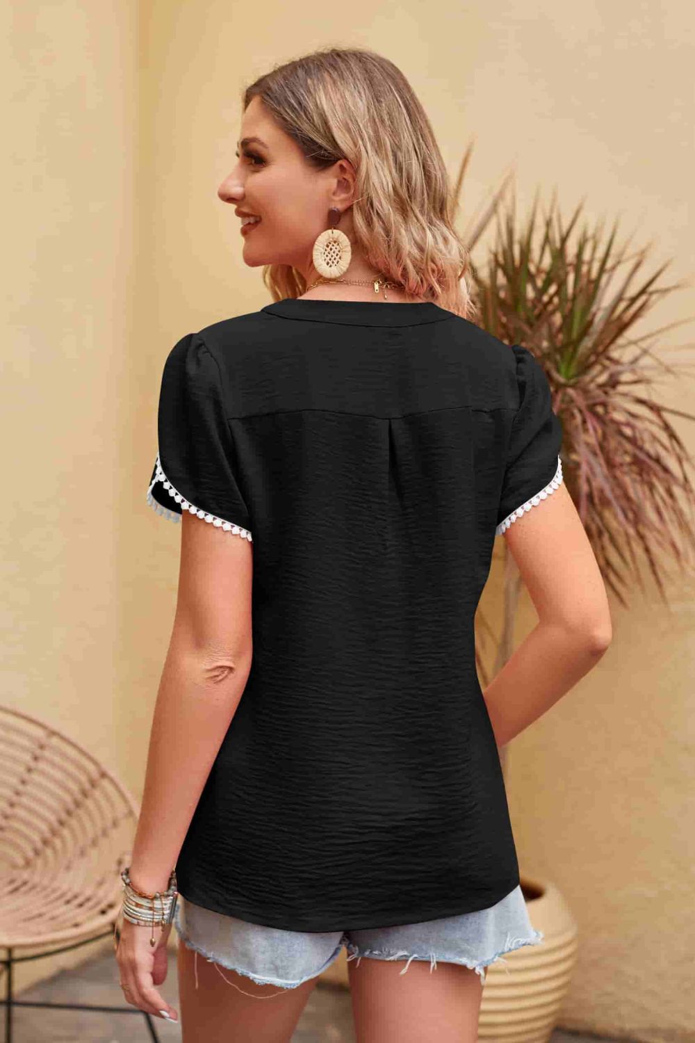 Contrast Trim Pom-Pom Detail Notched Neck Blouse