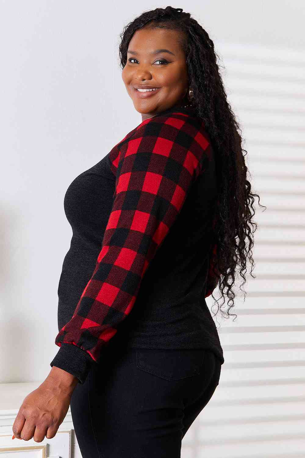 Heimish Full Size Sequin Reindeer Graphic Plaid Top