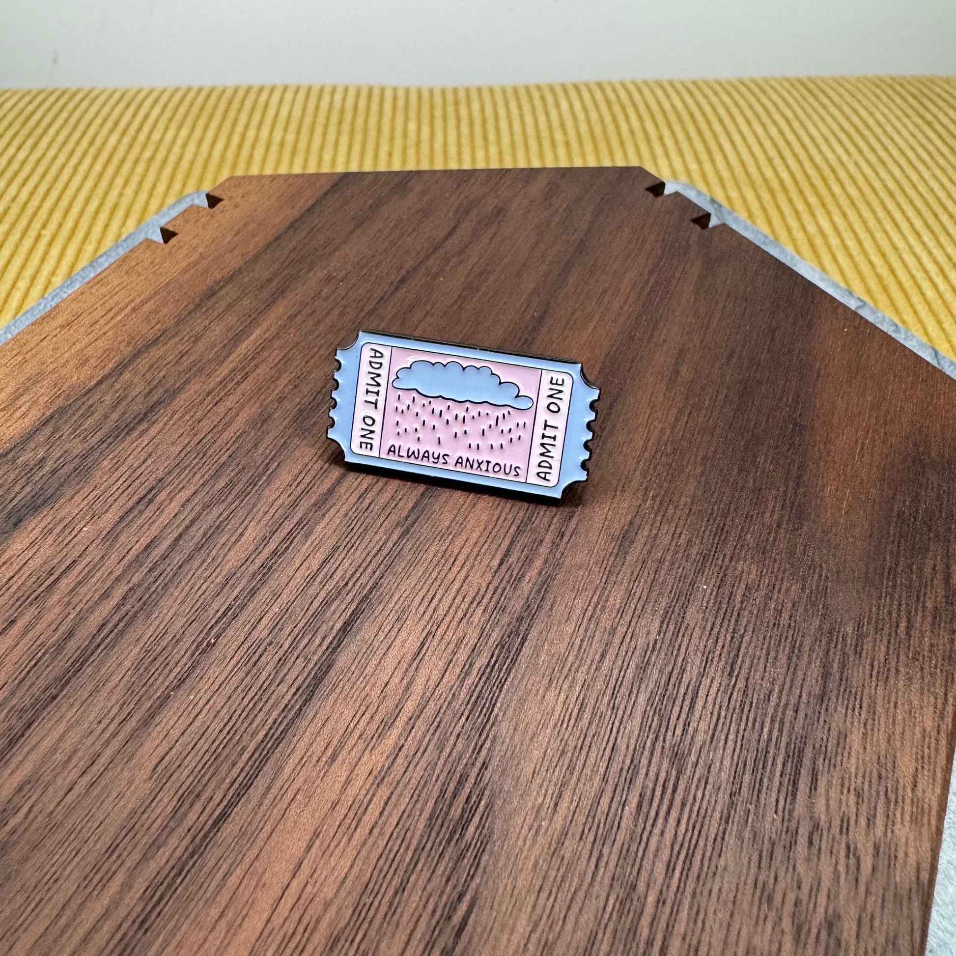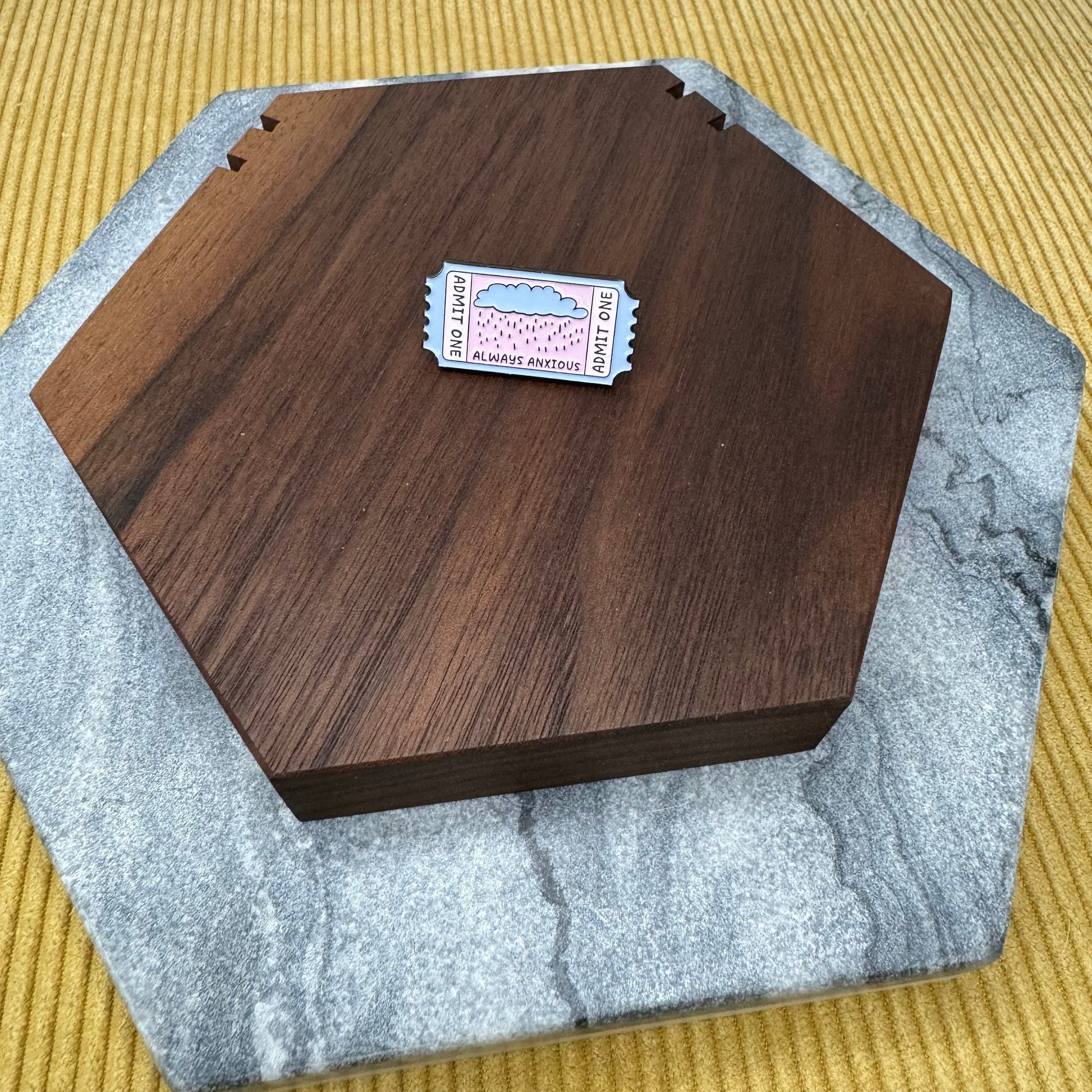 Metal pin, rubber backing. Size: 1” wide x 0.5” tall