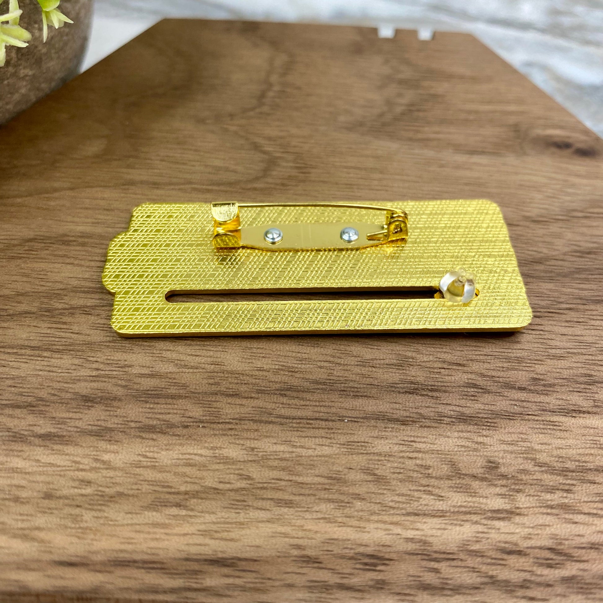 Metal pin with sliding lightning bolt. Size: 2.5” wide x 1” tall