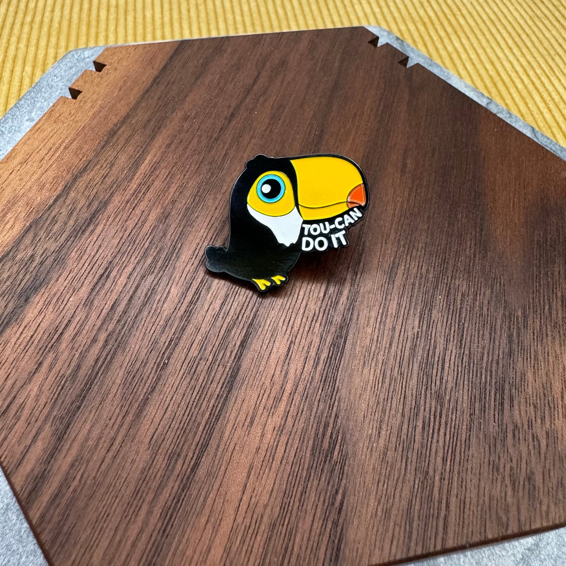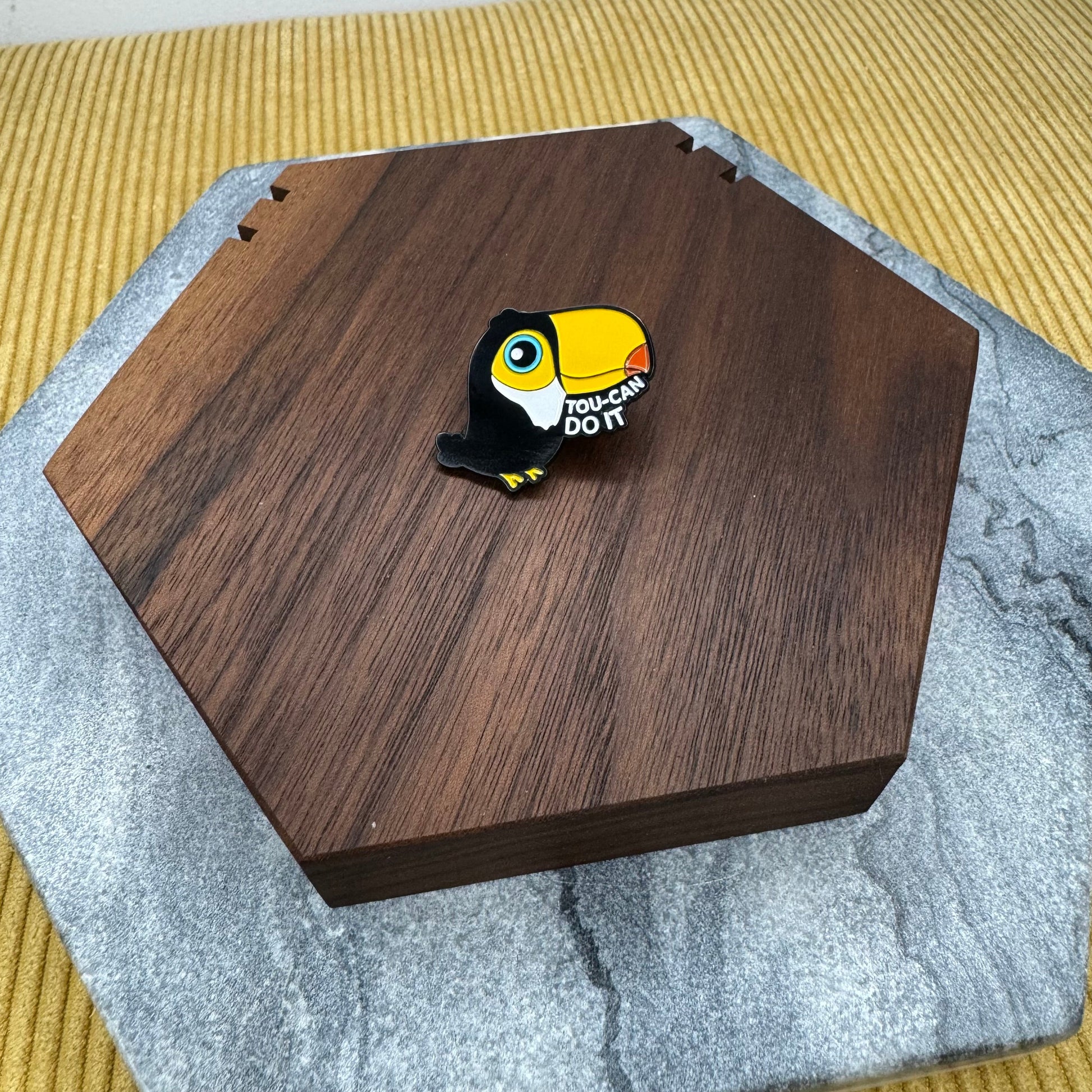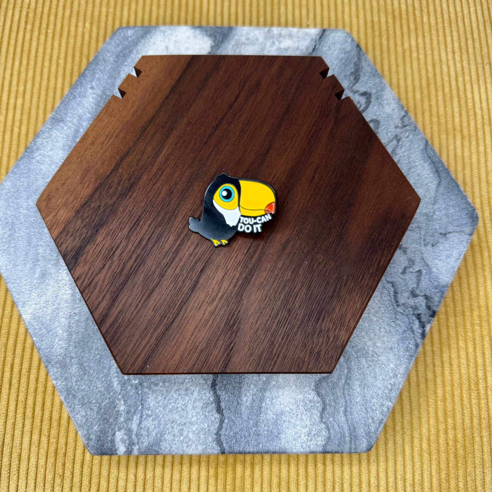 Metal pin, rubber backing. Size: 1” wide x 1” tall