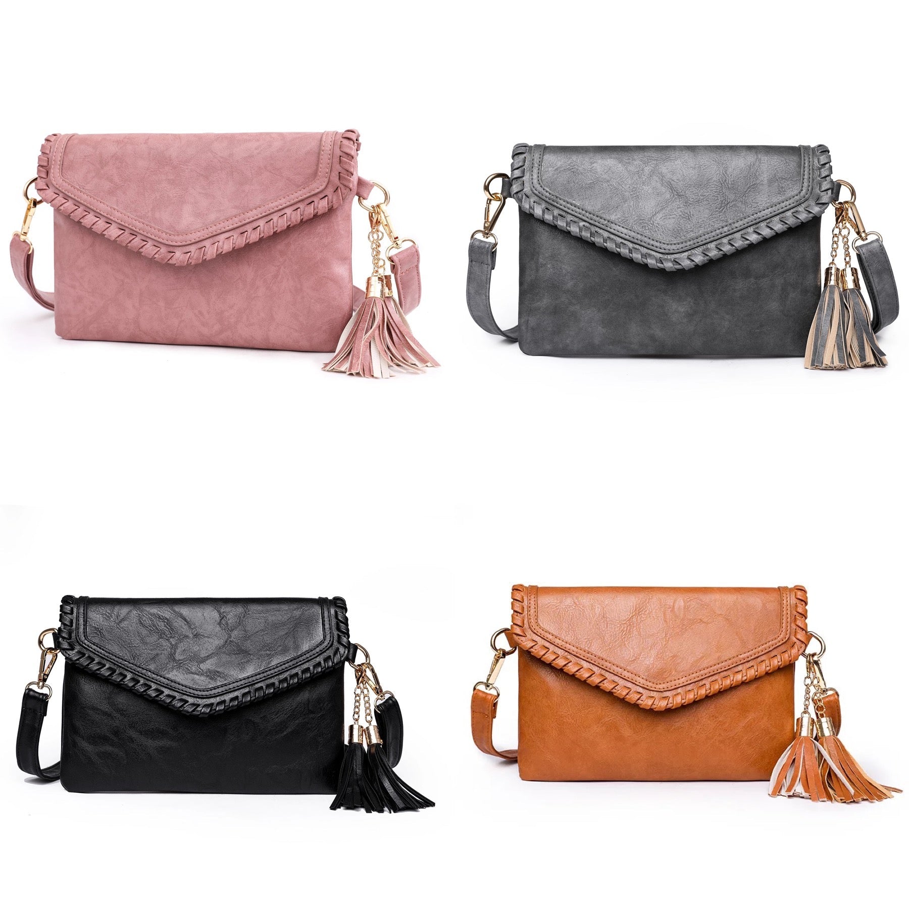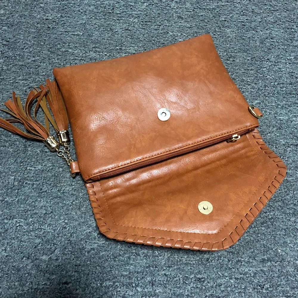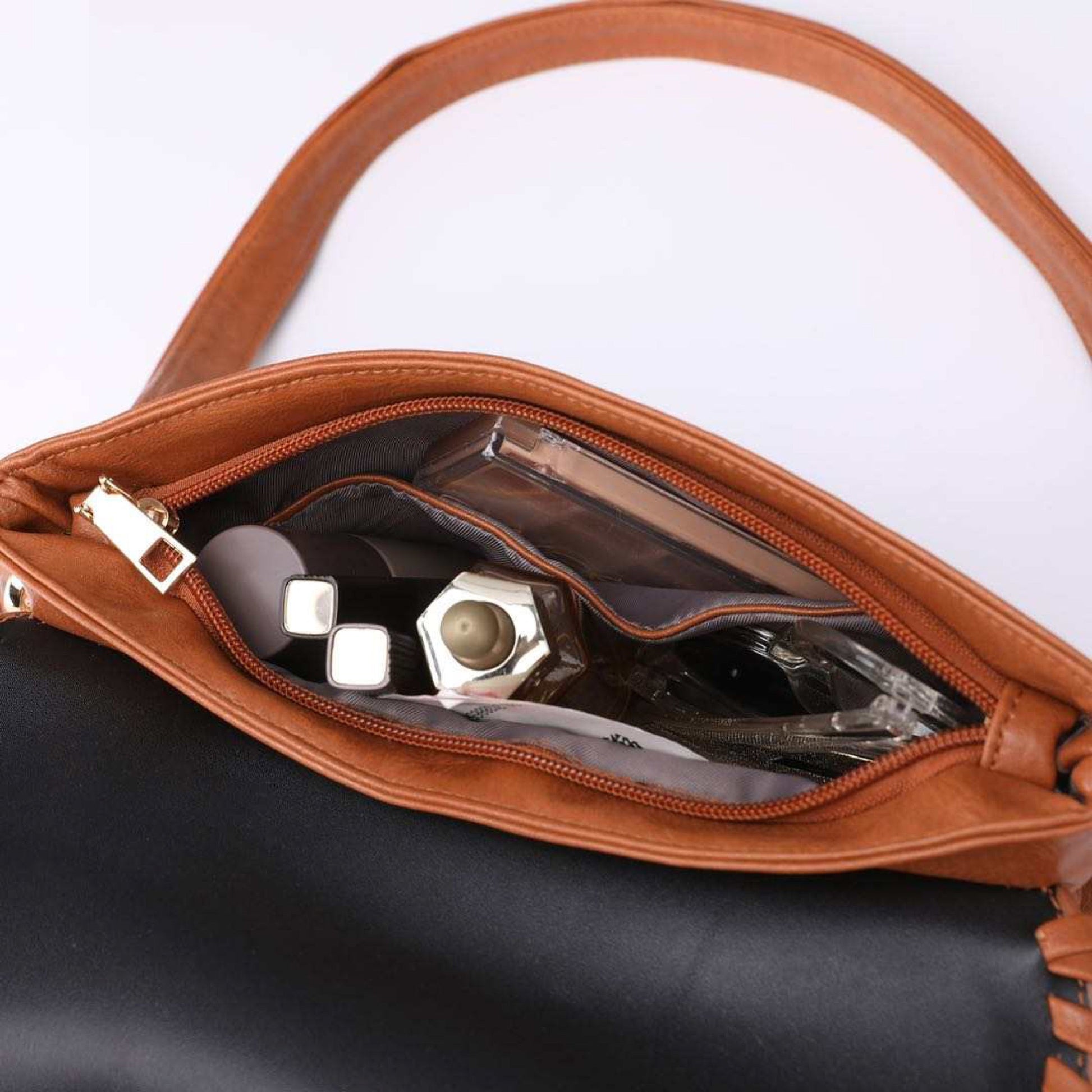 They feature 1 main zip compartment. Also comes with a solid print shoulder/crossbody strap.